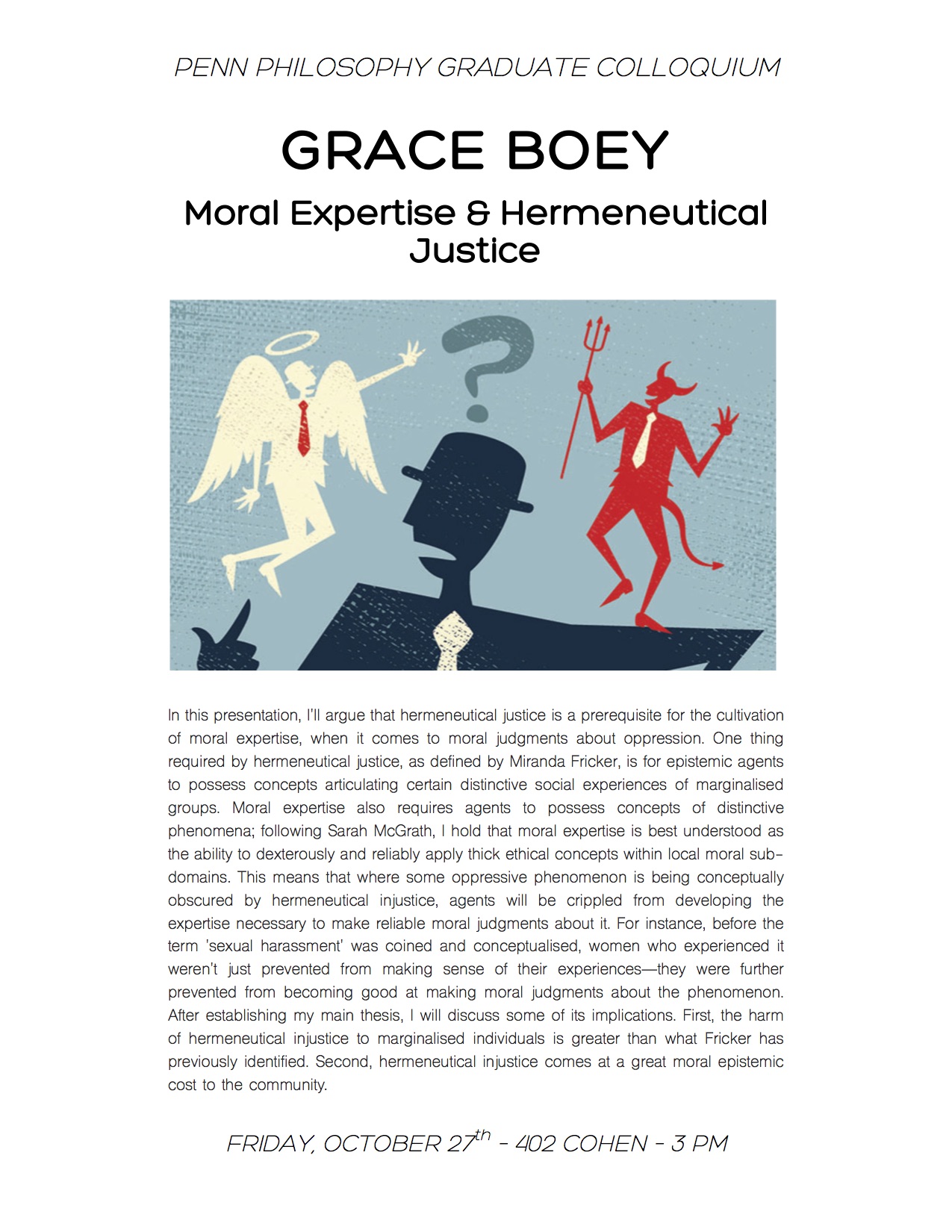 - Moral Expertise & Hermeneutical Justice (Oct 2017). Penn Philosophy Graduate Colloquium, University of Pennsylvania.
